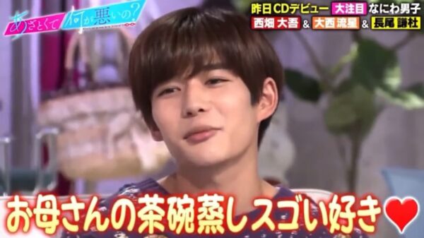 テレビ番組『あざとくて何が悪いの?』に、長尾、西畑大吾、大西流星の3人で出演した際に、長尾がお母さんとの電話で、「もしもしオカン?今日の夕飯何?茶碗蒸し?早く帰るわ」というやりとりをしていたと大西に明かされ、「お母さんの茶碗蒸しスゴい好きなんです」と恥ずかしそうに告白していました。